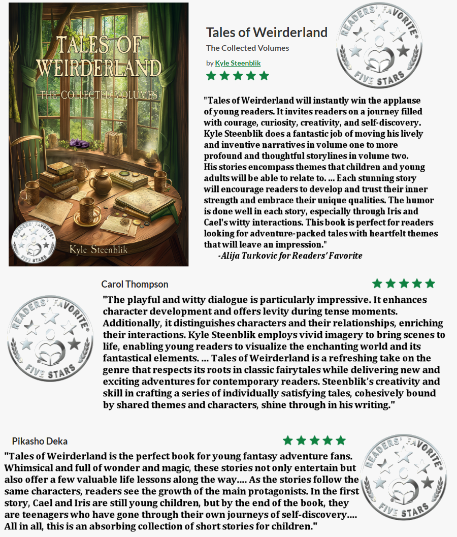 The playful and witty dialogue is particularly impressive. It enhances character development and offers levity during tense moments. Additionally, it distinguishes characters and their relationships, enriching their interactions. Kyle Steenblik employs vivid imagery to bring scenes to life, enabling young readers to visualize the enchanting world and its fantastical elements... Tales of Weirderland is a refreshing take on the genre that respects its roots in classic fairytales while delivering new and exciting adventures for contemporary readers. Steenblik's creativity and skill in crafting a series of individually satisfying tales, cohesively bound by shared themes and characters, shine through in his writing” — Carol Thompson for Readers' Favorite