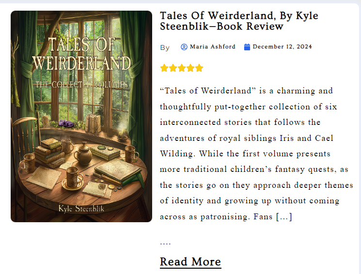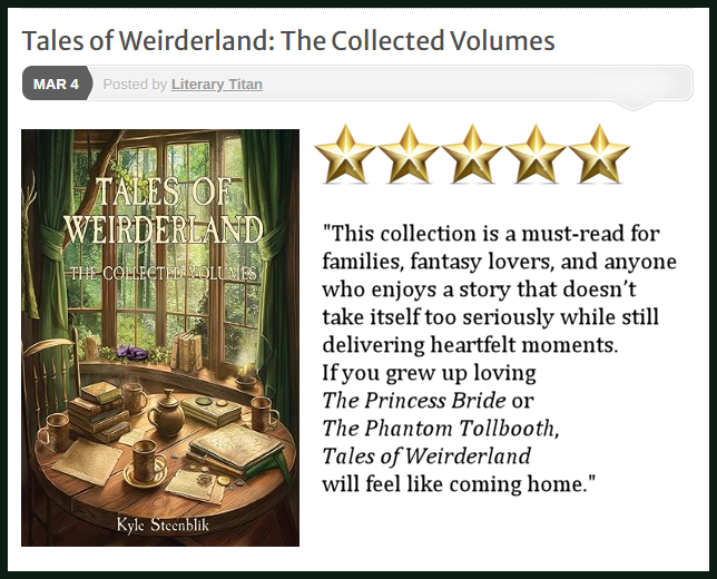 What surprised me most was the book's emotional depth. Though it starts as a fun, lighthearted read, the second trilogy carries a weightier message. Steenblik wrote these stories as a reflection of his children's growth, and it shows... This collection is a must-read for families, fantasy lovers, and anyone who enjoys a story that doesn't take itself too seriously while still delivering heartfelt moments. If you grew up loving The Princess Bride or The Phantom Tollbooth, Tales of Weirderland will feel like coming home” — Literary Titan